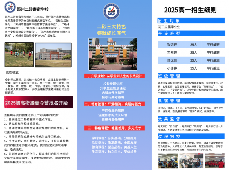 郑州二砂寄宿学校主打 “升名校” 通道,牵手清华大学、武汉理工大学、中国人民大学等顶尖院校,开设出国留学培训项目、国际项目及本硕直通车,让学生的升学之路更宽广。